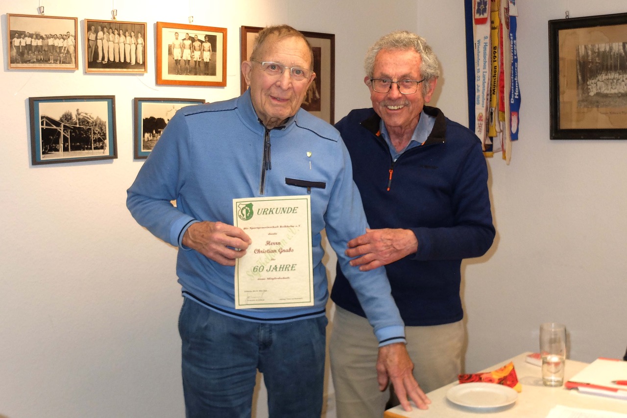 Für 50 Jahre Mitgliedschaft wurde Werner Kerber ausgezeichnet. Für 60 Jahre Vereinszugehörigkeit wurden Irmgard Kleinschmidt, Christian Grabs und Helmut Hinz geehrt. Den Höhepunkt bildete die Auszeichnung von Walter Lutz für beeindruckende 75 Jahre Mitgliedschaft. Eine derart lange Verbundenheit mit einem Verein – verbunden mit weiterhin aktiver Teilnahme – verdient höchste Anerkennung und großen Respekt.