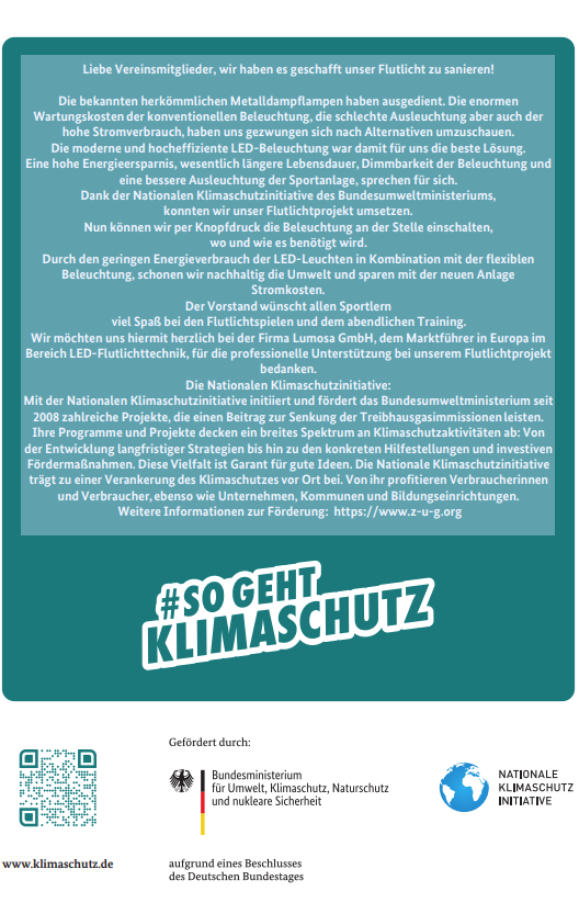 Wir möchten uns hiermit herzlich bei der Firma Lumosa GmbH, dem Marktführer in Europa im Bereich LED-Flutlichttechnik, für die professionelle Unterstützung bei unserem Flutlichtprojekt bedanken.